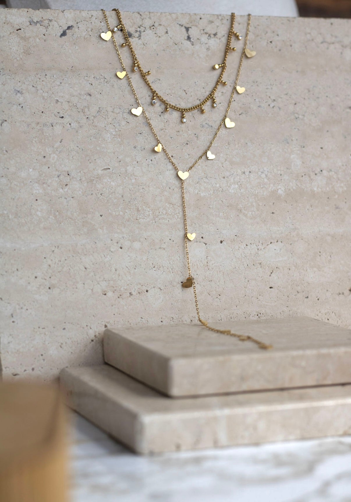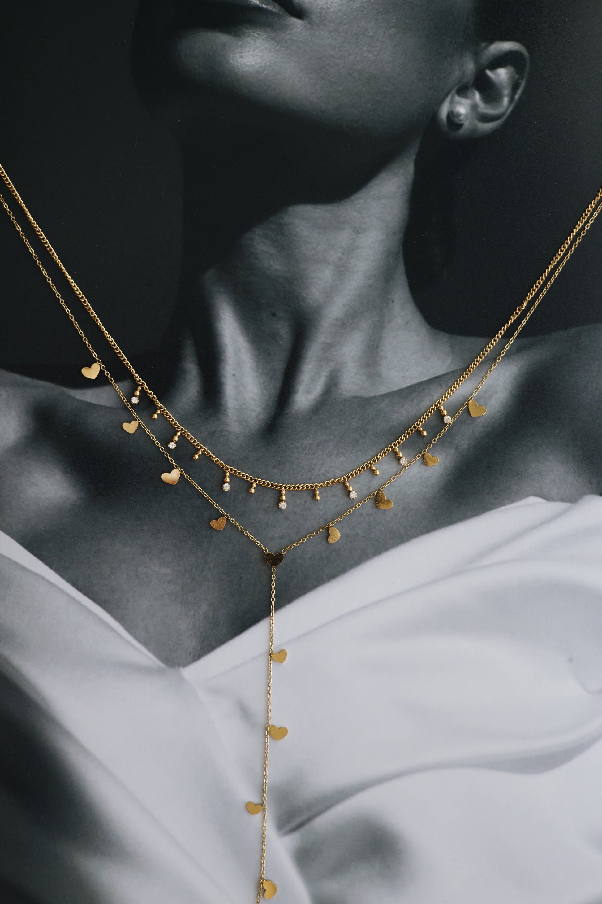 Set od dvije ogrlice od nehrđajućeg čelika sa pozlatom dolazi u slojevitom dizajnu s visećim zlatnim srčekima i decentnim cirkonima, što je čini savršenim dodatkom za dnevne i večernje kombinacije. Zahvaljujući visokokvalitetnom materijalu, ogrlica je otporna na vodu, znoj i ne tamni, pa je možete nositi bez brige svakog dana.
