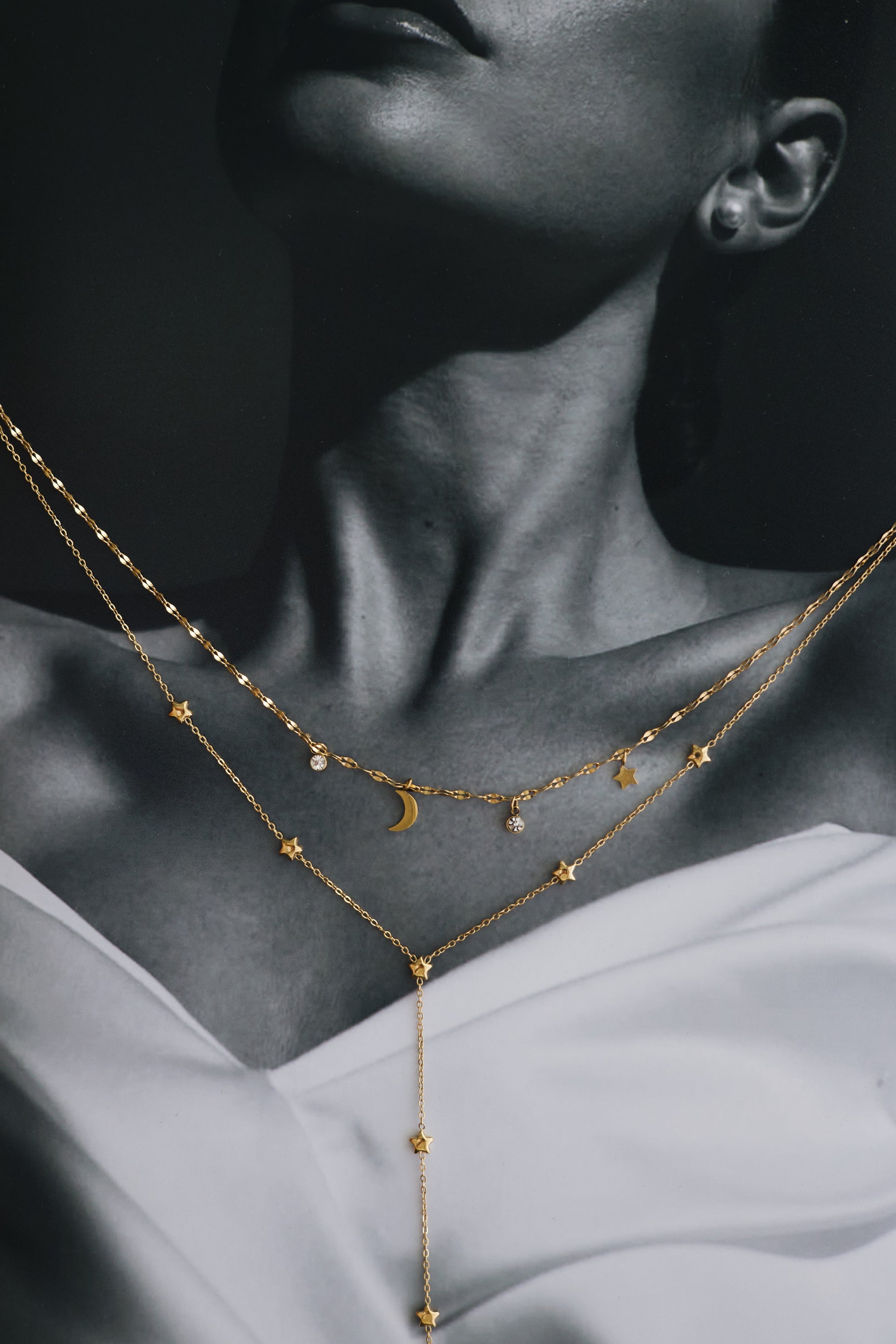 Set od dvije ogrlice od nehrđajućeg čelika sa pozlatom dolazi u slojevitom dizajnu s zlatnim zvijezdama i decentnim cirkonima te mjesecima, što je čini savršenim dodatkom za dnevne i večernje kombinacije. Zahvaljujući visokokvalitetnom materijalu, ogrlica je otporna na vodu, znoj i ne tamni, pa je možete nositi bez brige svakog dana.