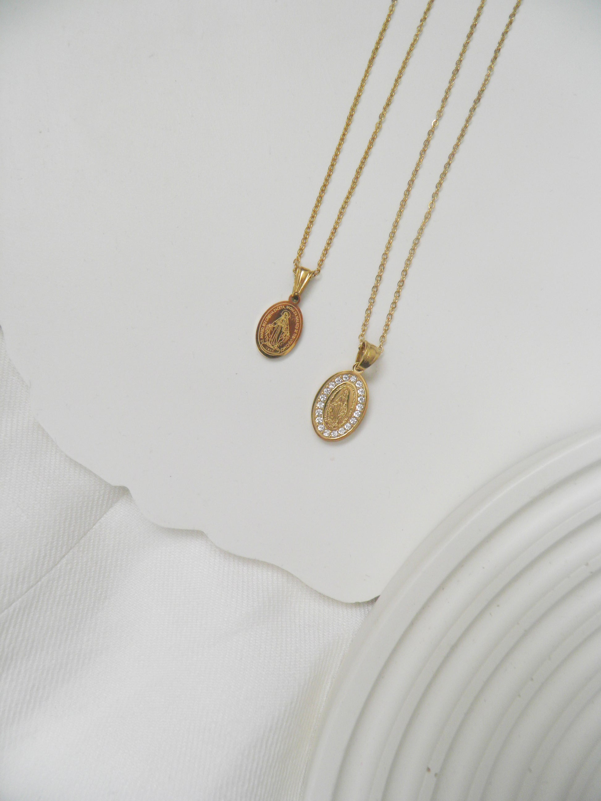 Decentni i jednostavni medaljoni, izrađeni od čelika sa pozlatom sa cirkonima ili bez njih. Veličina medaljona bez cirkona je 1, 5 cm, sa cirkonima 1,8cm.Ukoliko želite duži lanac, u napomeni prilikom naplate zapišite centimetre.