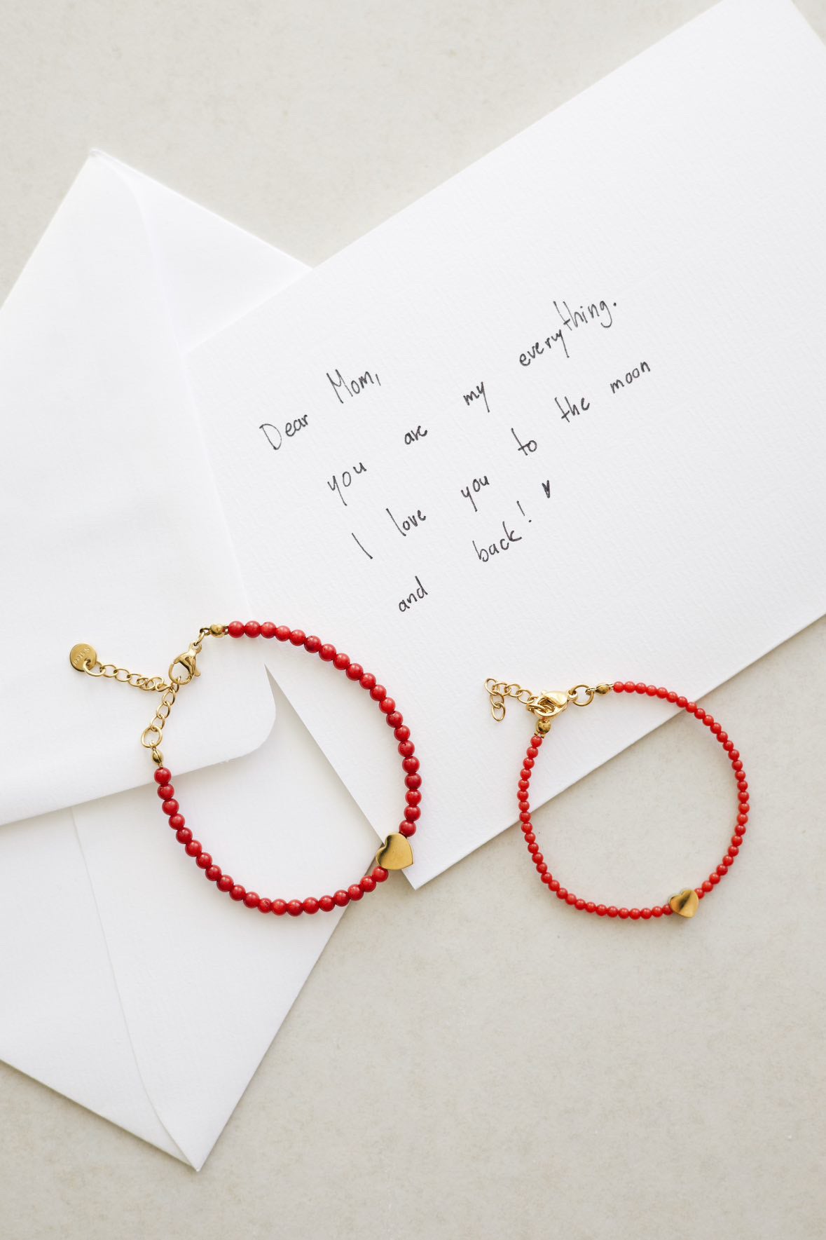 Set se sastoji od dvije narukvice – jedna za mamu, druga za curicu – povezane istim dizajnom i simbolikom. Srce od čelika u sredini predstavlja ljubav koja ne poznaje granice, a crvene perle od koralja donose osjećaj topline, zaštite i snage.