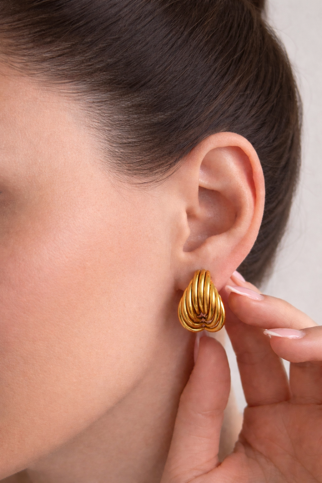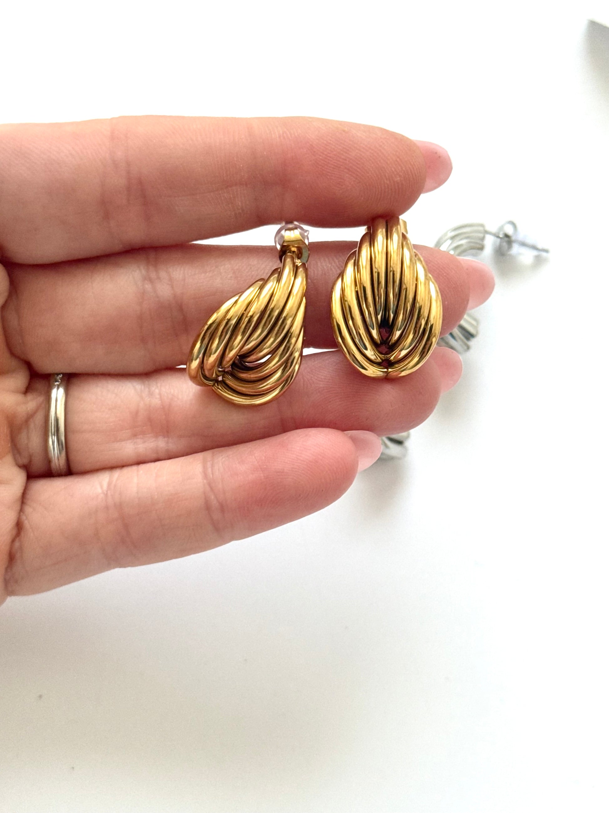 Elegantne naušnice modernog dizajna izrađene od kvalitetnog nehrđajućeg čelika s pozlatom. Lagane, izdržljive i idealne za svakodnevno nošenje ili posebne prilike.