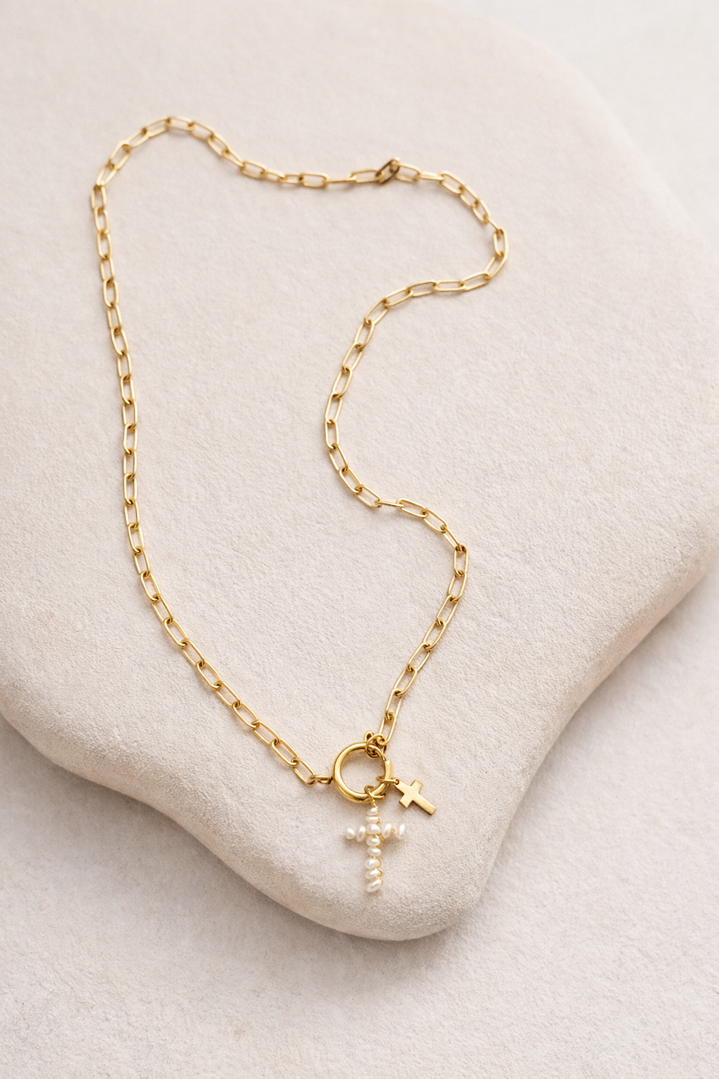 Ogrlica izrađena od čelika sa pozlatom, male karike koje čine lanac i križ izrađen od riječnih bisera, uz njega mali decentni križić kao dodatak. Idealno za nošenje svaki dan.