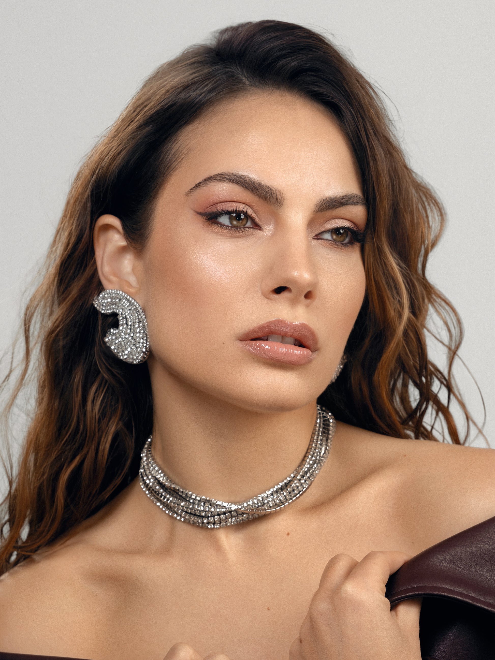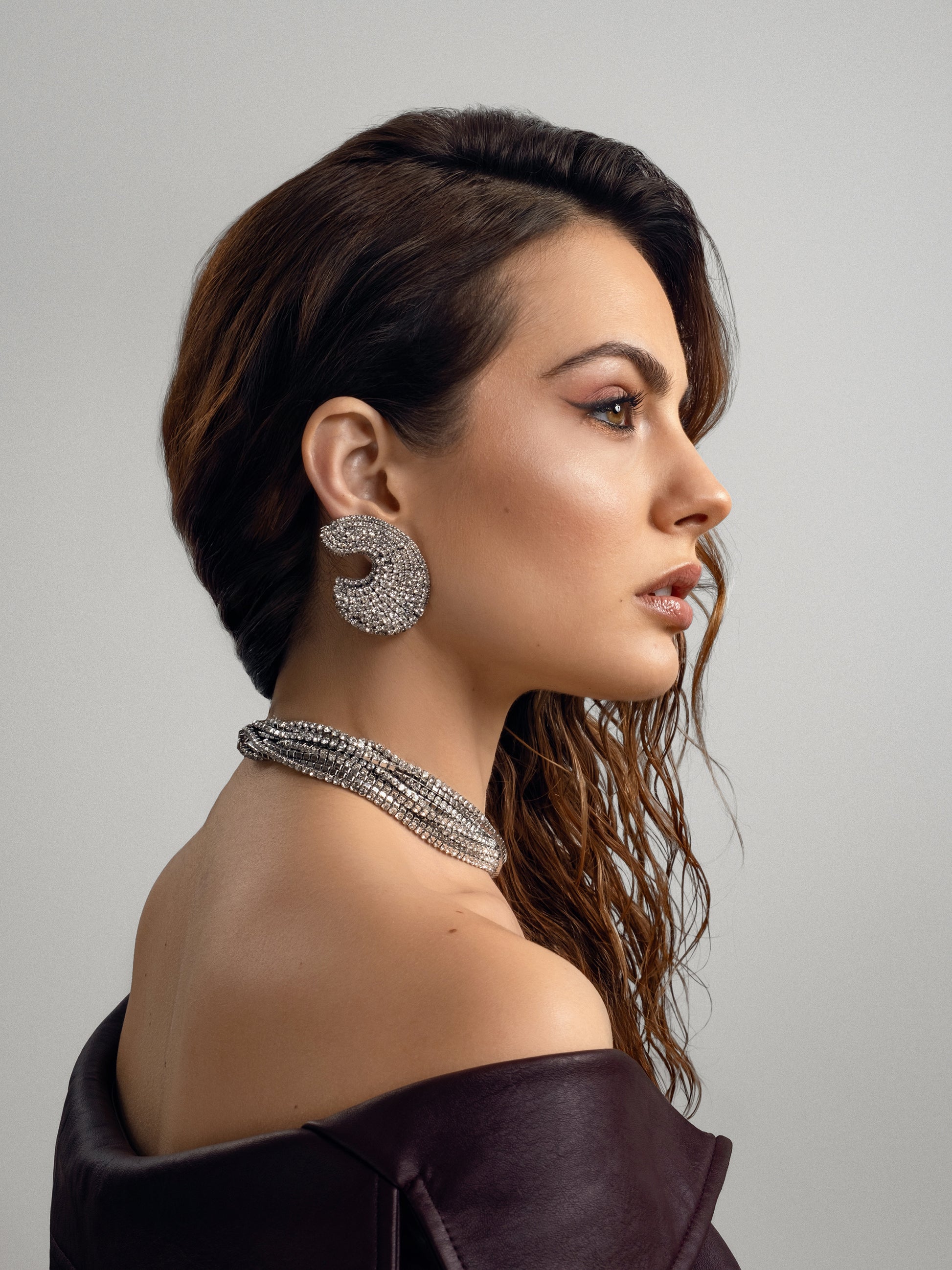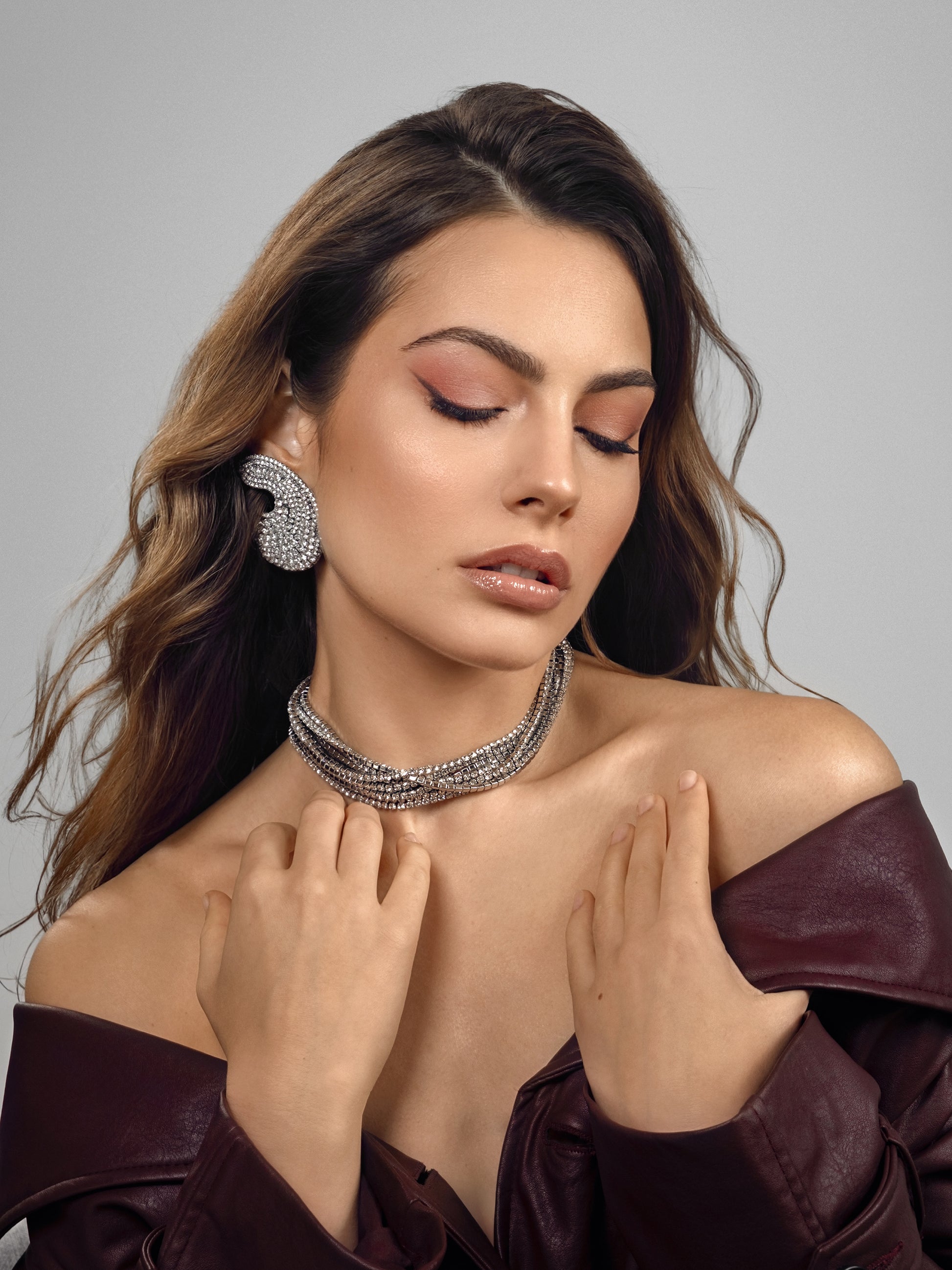 Choker ogrlica u postpunosgi izrađena od cirkona i nehrđajućeg čelika. Ogrlica ide uz vrat. Napravljena za normalnu debljinu vrata, pa ukoliko imate jači molimo to napisati u napomenu.