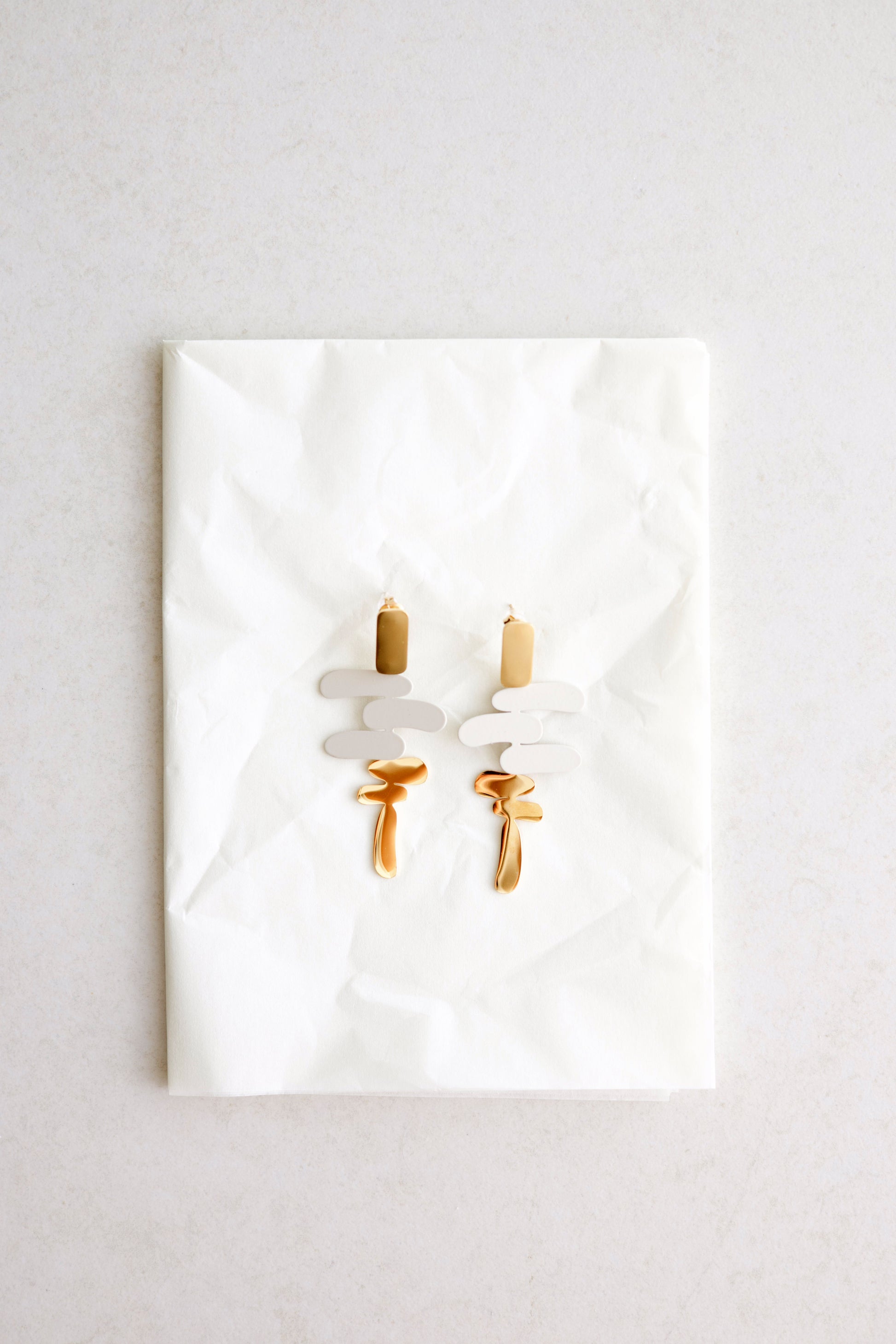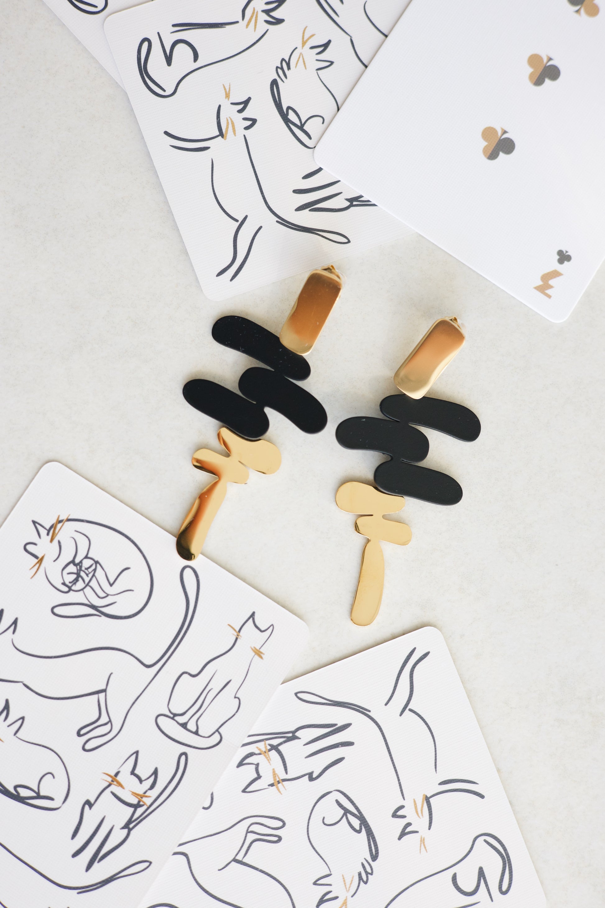 Posebne naušnice specifičnog oblika izrađene od čelika sa pozlatom te kombinacijom bijelog i crnog mat dijela. Kopčanje na iglicu.
