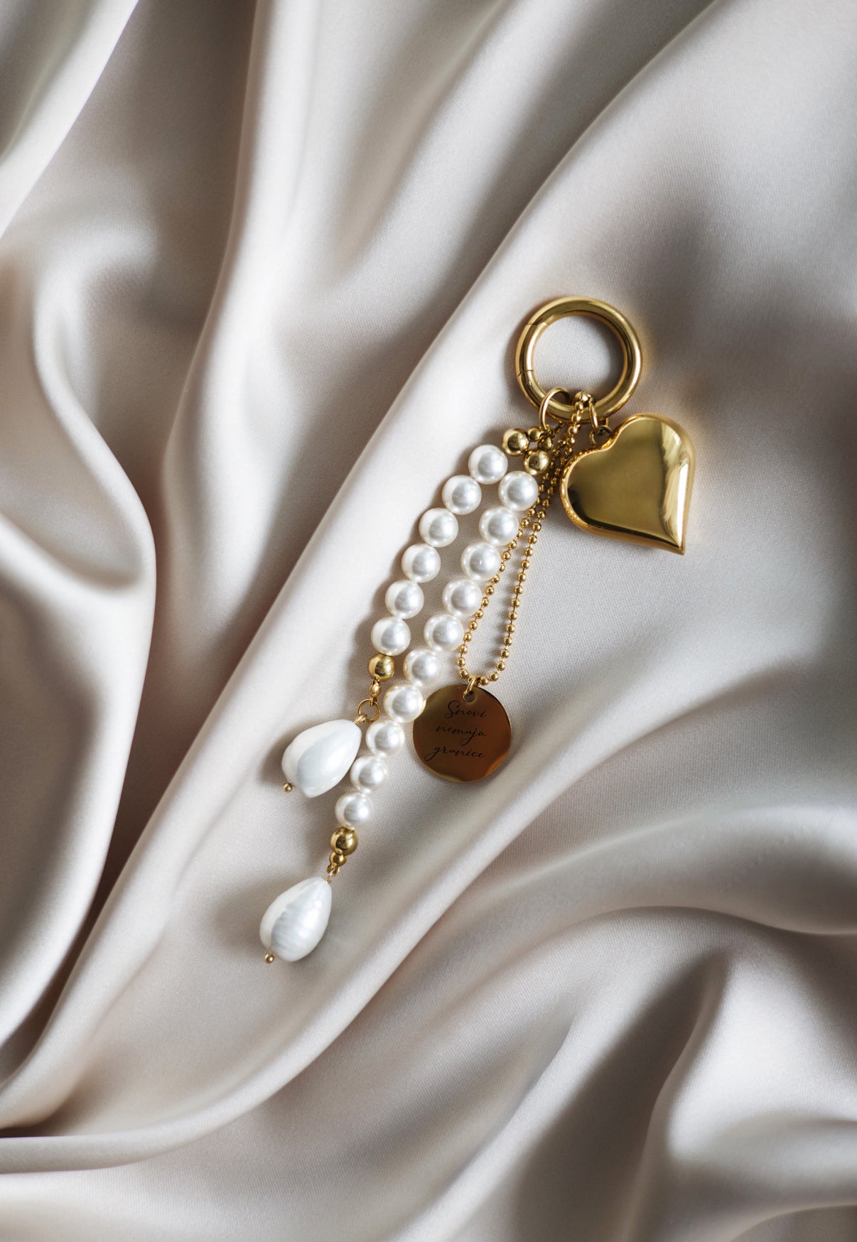 Personalizirani privjesak za ključeve ili torbu, izrađen od kombinacije pravilnih riječnih bisera i čelika s pozlatom.