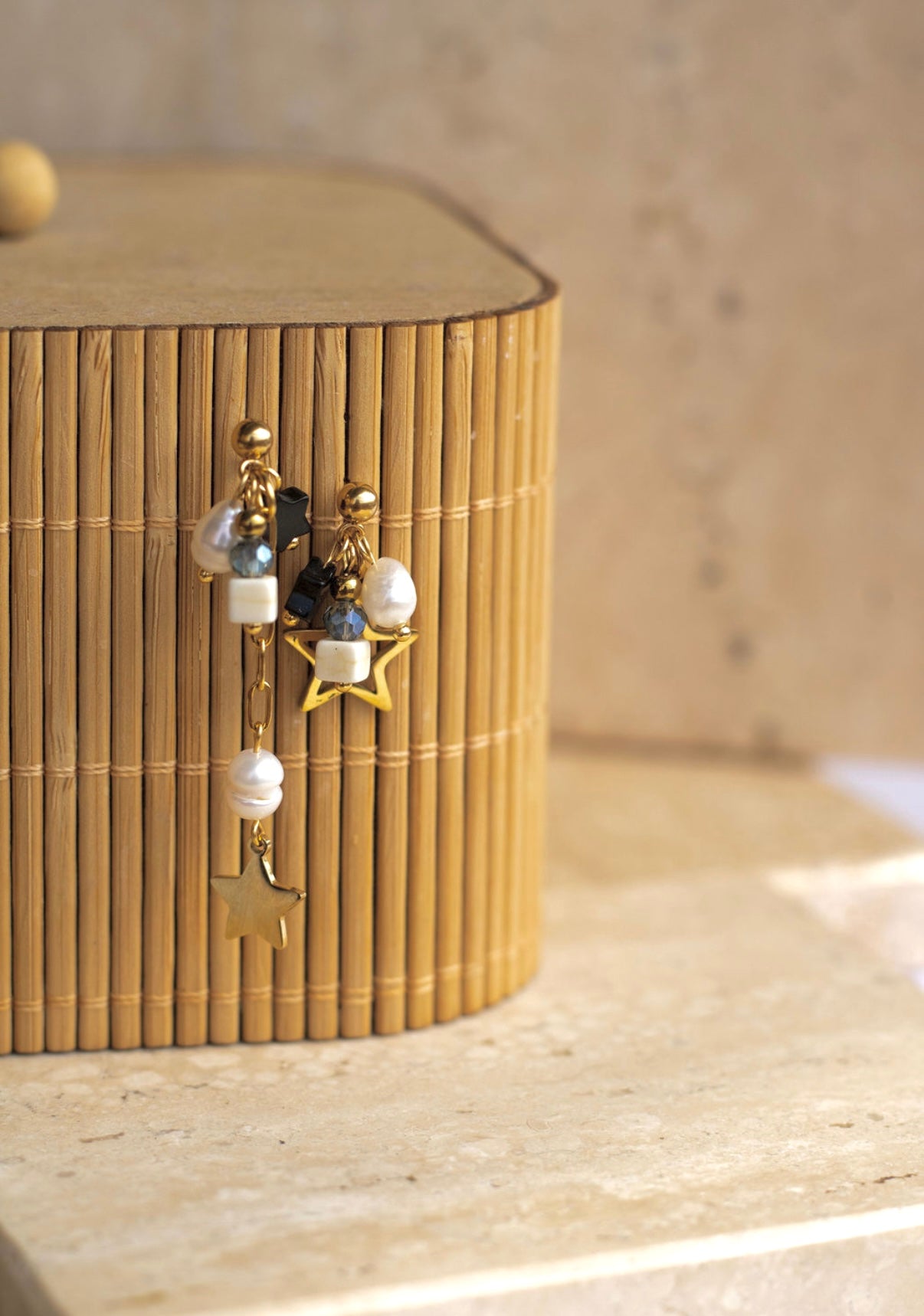 Naušnice izrađene u kombinaciji dragog kamenja i čelika. Zanimljivog oblika jer je jedna kraća, a jedna duža.